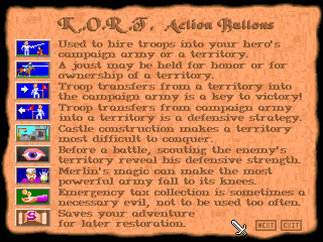 Из особенностей игрового процесса можно выделить возможность играть с любым количеством компьютерных противников (от одного до четырёх), несколько уровней сложности (весьма сильно отличающихся между собой по ИИ противников), возможность участвовать в рыцарских турнирах, где можно заработать дополнительные деньги для найма армий или даже выиграть какую-то провинцию (как договоритесь с соперником), также здесь можно строить замки на любой территории, куда вошла ваша армия (то есть ничто не мешает создать свою базу на чужой территории). Основа экономики в игре – это сбор налогов с крестьян и горожан, которые можно повышать и понижать (если повысить слишком сильно – люди восстанут). Все битвы в игре пошаговые, типов войск много, но управлять битвами или хотя бы видеть их никак нельзя. Наиболее же интересным моментом является помощь волшебника Мерлина – если вам удастся убедить его, что именно вы – наиболее достойный преемник Артура, то он (и его ужасная боевая магия) будет на вашей стороне в битвах.