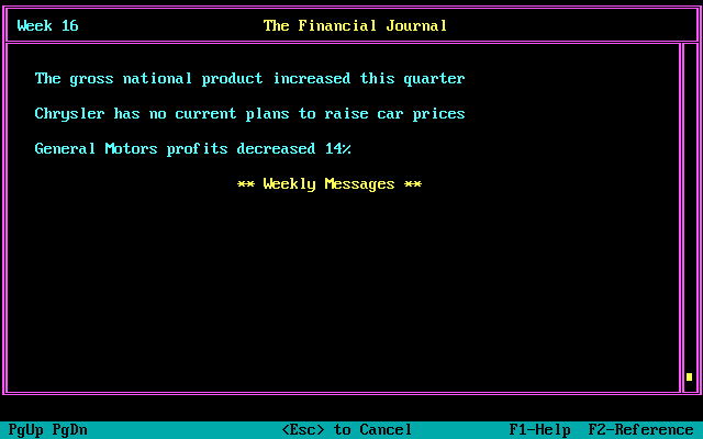 Каждый ход – это неделя игрового времени; за этот срок можно (и нужно) продавать и покупать акции, оценивать личный капитал и предлагаемые опционы, отслеживать по многочисленным графикам тенденции фондового рынка в целом и по отдельным отраслям деятельности в частности, читать новости, в конце концов. Конечно, назвать игру самым детализированным симулятором фондового рынка нельзя, но всё же она моделирует его с претензией на довольно высокую реалистичность и проработанность, а значит – представляет интерес для ценителей старых экономических игр.