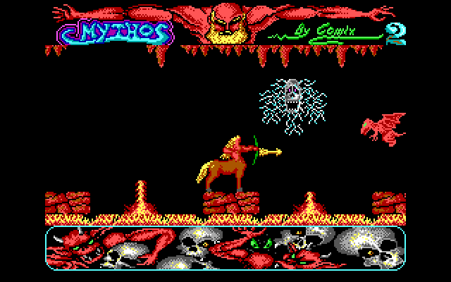 Что здесь сложного? Во-первых, то, что наш кентавр – это на редкость ничтожный кентавр, совершенно не похожий на своих могучих мифологических собратьев. Он не умеет драться вблизи, вооружён одним только луком, из которого очень плохо стреляет, а главное – он мгновенно погибает от любого контакта с врагом, будь то попадание какой-то пущенной в него врагом субстанции или просто столкновение. Во-вторых, то, что очень большое число врагов в игре не может быть побеждено, ибо попасть в них из лука невозможно (траектория стрельбы у кентавра одна, прыгать он может, но хоть немного поднять или наклонить лук – нет), а по размеру твари, как правило, куда меньше его. Вот и приходится совершать грациозные прыжки в надежде не угодить на какую-нибудь дрянь (а такое нередко случается). Лучшие враги здесь – это демоны: эти хоть летают, в них можно попасть… А вот черви, судя по всему, непобедимы. И это не единственные такие враги, которые уйдут от наказания: например, здесь будет бог Зевс (наверное), который кидает с равным интервалом молнии сверху, или гигантский краб в воде, которого никак нельзя победить, останется лишь уворачиваться от его клешней…