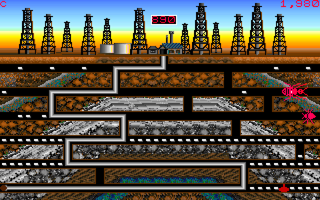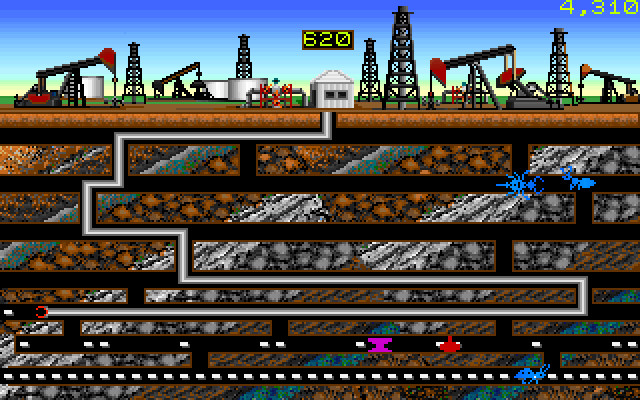 Добыча нефти осуществляется прокладыванием трубы по данному лабиринту, нефть выглядит как белые прямоугольники (…). Наша задача на каждом уровне – собрать (добыть) всю имеющуюся нефть. Но, разумеется, этот процесс должен быть чем-то осложнён, и так есть – в лабиринте обитают всевозможные членистоногие (пауки, жуки, муравьи и так далее), которые ползают по его туннелям. Если они касаются какой-то части проложенной вами трубы – то теряется одна жизнь. С другой стороны, если труба упрётся в них «сверлом», то они погибнут и почему-то прибавят нам уйму очков (то есть как бы дадут много нефти). Также есть и неодушевлённые опасные объекты – бомбы и наковальни. С ними всё наоборот: если они соприкоснутся где-то с трубой – то ничего страшного, а вот если в них врезаться «сверлом», то будет плохо.