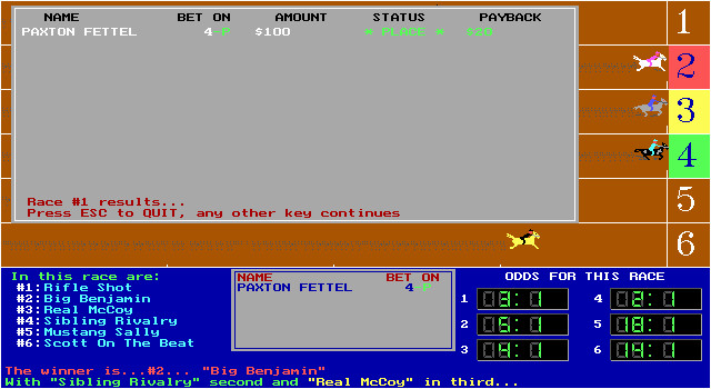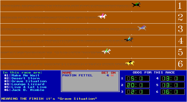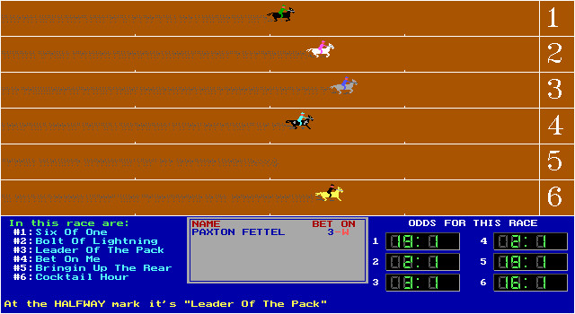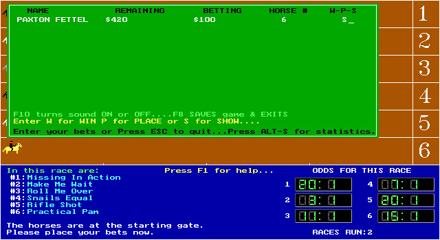 Интерфейс у игры вполне удобный. Перед стартом каждому игроку даётся пятьсот долларов стартового капитала, и всю эту сумму или часть её можно поставить на конкретную лошадь, предварительно выбрав её из списка, включающего более двухсот имён; имена лошадей, участвующих в забеге, во время игры отображаются в нижней (синей) части экрана. Обратите внимание на то, что поставить можно не только на приход лошади первой (win), но и на её второе (place) и даже третье (show) место. После того как все игроки делают свои ставки, начинается непосредственно забег.