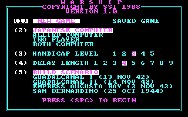 На выбор четыре исторических сражения: две фазы битвы за Гуадалканал, битва в заливе Августы и бой в проливе Сан-Бернардино (надо признать, не самые известные битвы и в других играх на подобную тему вроде бы вообще не затронутые), но есть возможность с помощью встроенного редактора создать свой сценарий.