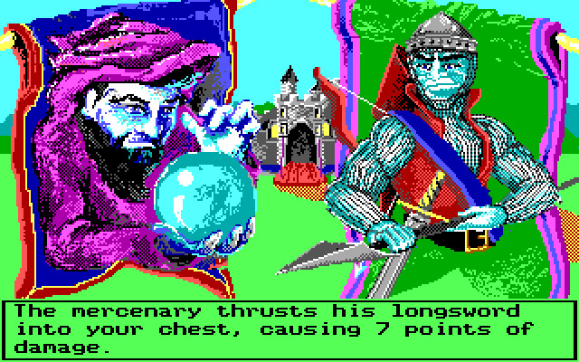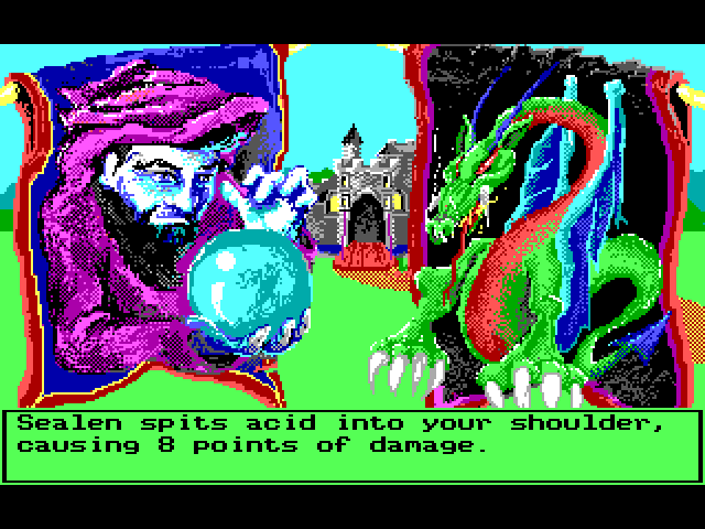 Геймплей полностью пошаговый, перемещение дискретное. В боях ходим по очереди с противником, за каждый ход можно совершить только какое-то одно действие. Поскольку наш герой – маг, то оружием он пользоваться не умеет, поэтому большая часть действий в бою – применить какое-то заклинание или выпить какую-либо микстуру. Кстати говоря, в этой игре от противника можно попробовать и убежать.