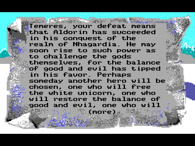 Сюжет, к сожалению, не очень понятен. Действие происходит в загадочном мире, где население страдает от монстров, служащих злому магу по имени Алдорин. Мы играем за доброго волшебника Темереса, которому необходимо воссоединить Чёрного и Белого единорогов (!), чтобы восстановить космический баланс и получить возможность победить зло. Пройти предстоит три больших локации, где можно найти множество предметов, охраняемых сильными врагами (особенность – поиск предметов обычно последовательный: нахождение одного в будущем поможет нахождению другого).