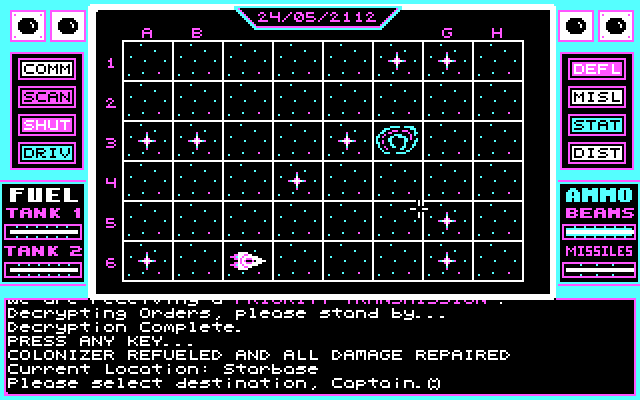 Хотите осмотреть весь сектор в традиционной «сетке»? Пожалуйста, есть глобальная карта. Только какой-то конкретный участок? Нет проблем, выбирайте карту отдельной системы (все эти карты, кстати, здорово прорисованы). А может быть, посмотреть на материки конкретной планеты (!) крупным планом, почти в 3D? И это здесь возможно, а ведь игра вышла в далёком 1989 году… Ах да, хотите во время боёв с пришельцами лично поуправлять космическим истребителем? Тоже не вопрос, потому как в игре предусмотрен режим симулятора. Конечно, бои здесь довольно условны, хотя и сложны, но когда вспоминаешь год выхода игры, то впечатление они производят весьма сильное.