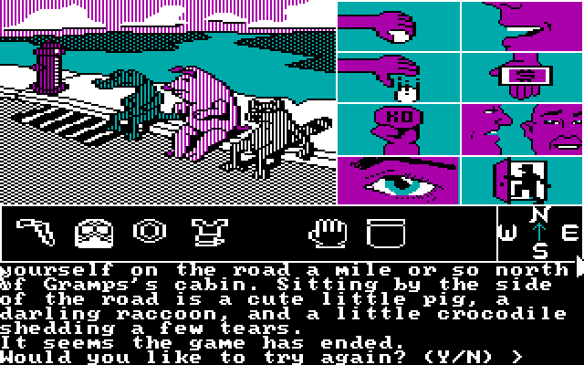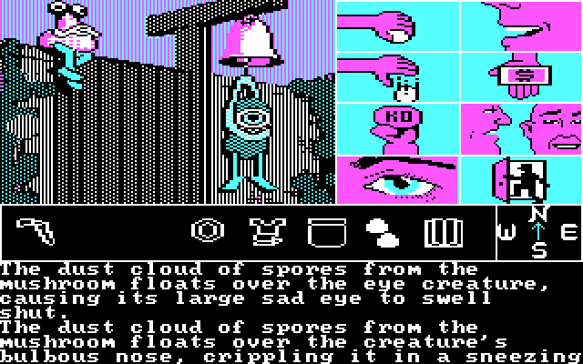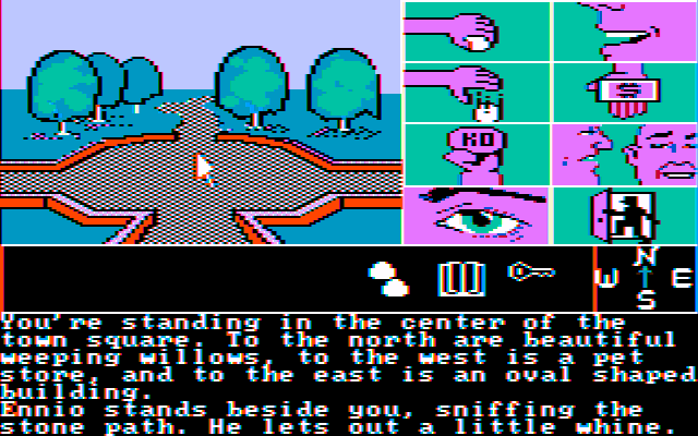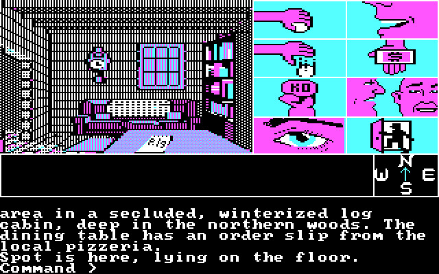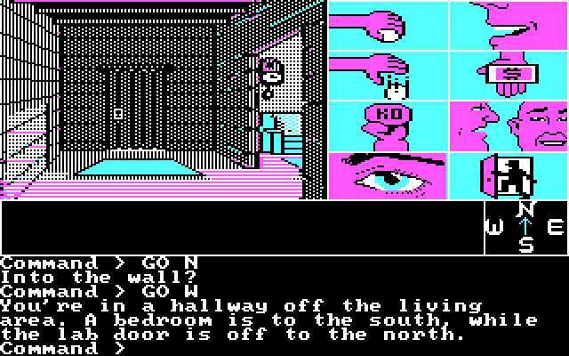 Зато в техническом плане тут всё очень даже примечательно - и благодаря поддержке мыши (реализованной в обход драйверов, ибо запускалась игра с загрузочной дискетки!), и по причине какого-никакого point-and-click управления (за год до "Maniac Mansion"), и благодаря неплохому сочетанию "обычного" текстового приключения с пусть и скромными, но графикой и звуковыми эффектами.