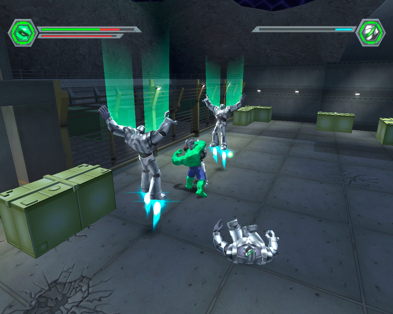 На одном из уровней вам также встретятся роботы-киборги. Они довольно массивные, ростом также почти с Халка, но менее плотные и сильные, однако выносливые и подготовленные как к ближнему, так и к дальнему бою. Один киборг не очень опасен, но проблема – вновь в их численности, которая весьма и весьма велика. Кроме того, в игре вам предстоит иметь немало дела со всевозможной военной техникой – турелями, вертолётами и танками. Все танки стреляют ракетами и, кроме того, окружены защитными силовыми полями, то есть разбить руками их довольно сложно. Выхода три: а) всё же суметь запрыгнуть на танк и разбить его руками сверху, несмотря на поле (сложно, но возможно, - доказано); б) пробить поле танка и прибить затем сам танк какими-либо предметами; в) частный случай пункта б) – поймать руками (да, Халк может и это!) ракету, выпущенную танком, и затем швырнуть её в него же, - эффект отличный; г) просто убежать от танка (довольно актуально на «танковом уровне», где их масса, хотя уничтожить все вполне реально).