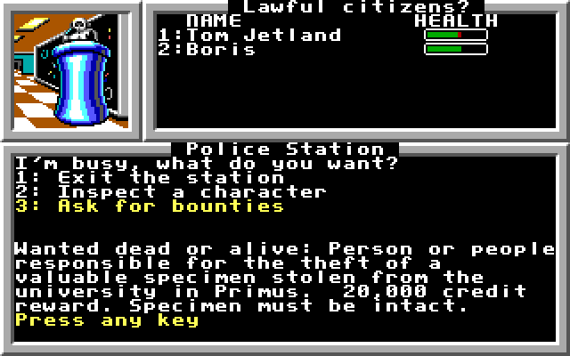 Почему именно на поверхности планеты – потому что формально в городах можно обойтись и без них; тем не менее иногда персонажи там сами нападают на вас, а ещё в этой игре есть возможность быть «злым», и ничто не мешает напасть с видом от первого лица на мирных людей. Есть возможность просмотра карты местности, что в RPG тех лет встречалось не очень часто; также, разумеется, есть достаточное количество NPC и множество разных объектов для посещения (например, госпитали, где можно лечиться, или оружейные магазины для покупки оружия и брони, разные бары и так далее – этот зловещий мир действительно выглядит «живым»!).