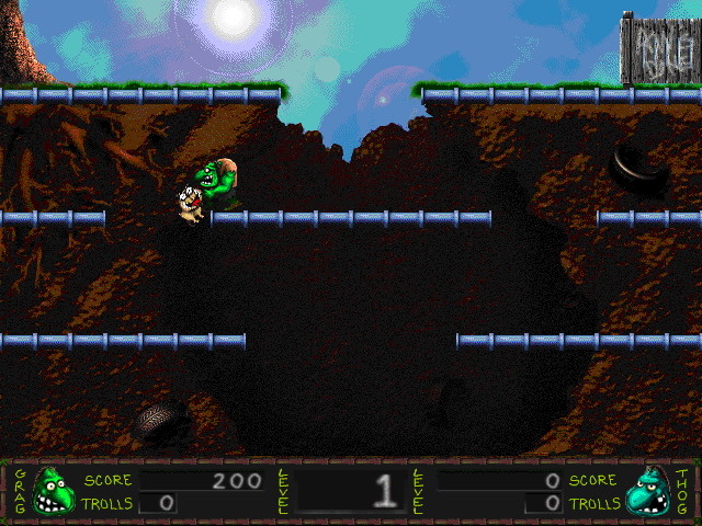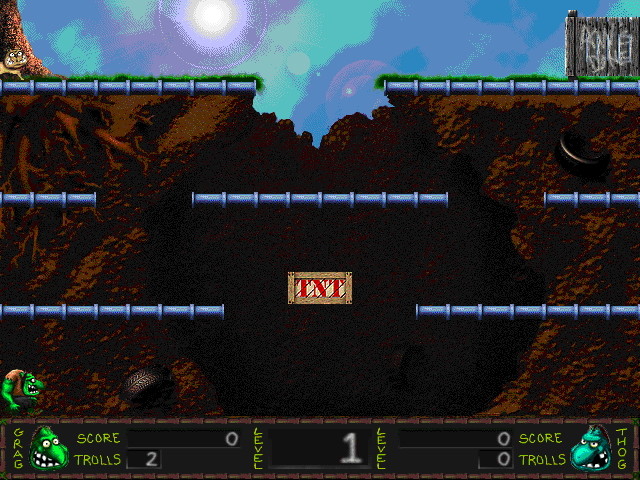 В этой игре даже есть сюжет: в город троллей под названием Trollsville вторглись орды врагов-животных, возглавляемые монстрами, и стали пакостить жителям. Тогда мэр города призвал двух великих героев-троллей, Grag’а и Thog’а, чтобы они избавили Trollsville от этой напасти. За одного из троллей вам и предстоит играть; можно сразу играть одному и только за одного героя (им всегда будет Grag), можно выбрать себе напарника Thog’а (им будет управлять компьютер), а можно играть с приятелем вдвоём за одним компьютером за обоих героев.