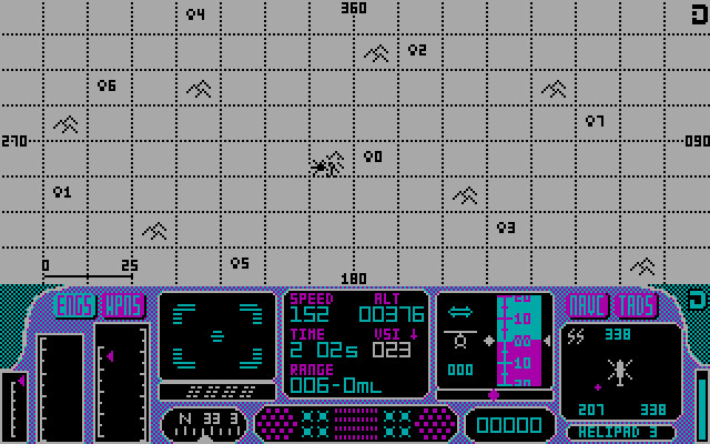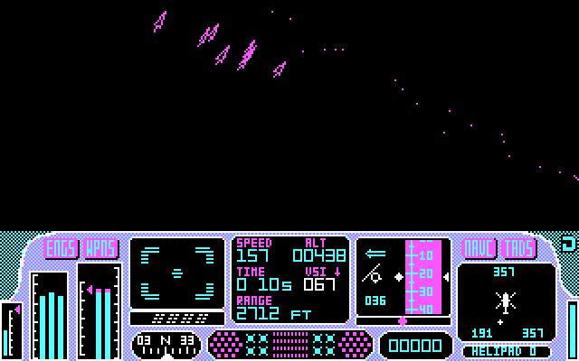 Графически игра для своего времени выглядит, пожалуй, выше среднего. Да, здесь только CGA, но всё-таки есть вражеские вертолёты, танки, башенки (которые не так и плохо прорисованы, кстати), а ландшафт – не просто плоскость, а с встречающимися (пусть и очень-очень редко) горами и деревьями. Вердикт – неплохо, но всё же – в первую очередь для верных поклонников старых симуляторов, как из-за управления, так и из-за графики.