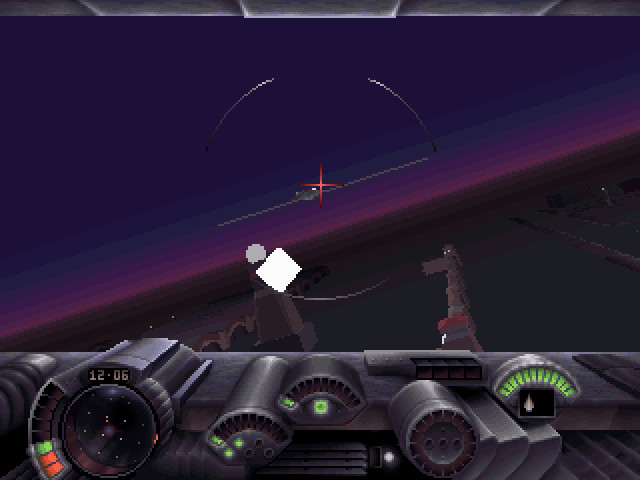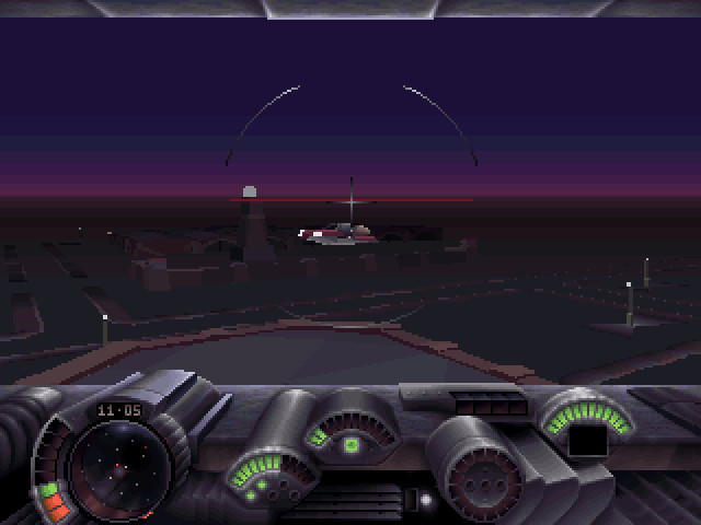 Игра сделана явно начинающими любителями в области игростроения, но качество графики всё равно очень хорошее, тем более для того времени. Приятно подобранная палитра цветов, характерная для страны вечных сумерек, а также дизайн приборной панели летательного аппарата сразу же приковали моё внимание к этой игре. Дело в том, что Darker с чьей-то лёгкой руки практически везде позиционируется как космосимулятор, что, разумеется, далеко не верно. Здесь вы управляете летательным аппаратом, передвигающимся в атмосфере и приводимым в действие реактивными импульсами. Никаких звёзд на небе и перемещения в полном 3D, характерных для космосимов, здесь нет. Скорее, это игровое изделие нужно классифицировать как симулятор футуристической летающей боевой машины. Ваш аппарат «Caero» поначалу оборудован довольно примитивным вооружением, но постепенно учёные и инженеры города «постараются», и ваша мощь будет усиливаться с прохождением миссий. Передвижение возможно только в пределах регулярной сетки неких пилонов, через которые беспроводным способом передаются на ваш летательный аппарат скудные порции энергии, которой так не хватает городу, живущему в вечных сумерках тёмной стороны планеты. А проще говоря, это столбы, сильно напоминающие наши фонари вечернего освещения на улицах.