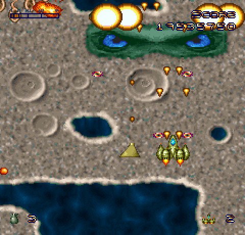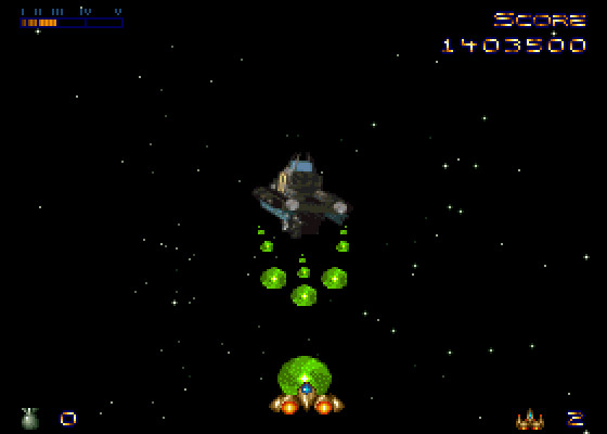 Я неспроста назвал Future Dimension несложной игрой. Дело в том, что здесь, в отличие от многих других аркад такого рода, игрок не умирает от одного-единственного попадания. Наоборот, в левом верхнем углу отображается довольно длинная шкала повреждений, которую к тому же можно восполнить бонусами, остающимися после уничтоженных противников. Помимо бонусов на восстановление «здоровья» нам будет попадаться ещё много всякой всячины, как-то: новые виды вооружения, автономные микромодули с автоматическим режимом стрельбы, самонаводящиеся ракеты, сверхмощные лазеры, даже дополнительные попытки. К сожалению, как-либо контролировать, какую именно систему следует улучшить, мы не можем, так как все бонусы активируются сами собой сразу после их подбора. Остаётся лишь сосредоточиться и не подбирать то, что вы посчитаете ненужным. Однако это едва ли станет проблемой – различные виды вооружения если и уступают друг другу, то ненамного, а в критических ситуациях и битвах с боссами вас всегда спасут супер-бомбы – их количество ограничено, но даже самый большой флот противника не устоит под их взрывами.