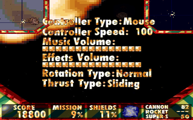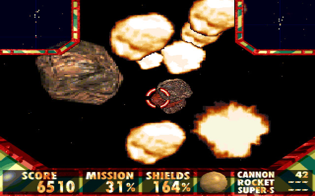 Бонус всегда появляется после уничтожения астероида, и как только последний уничтожен, огонь сразу же следует прекратить, ибо можно уничтожить и сам бонус. Видов оружия не очень много: снаряды, бомбы, ракеты и супер-оружие. Интересно, что количество очков на уровне определяется не числом уничтоженных астероидов, а числом выстрелов (на мой взгляд, это не очень хорошо).