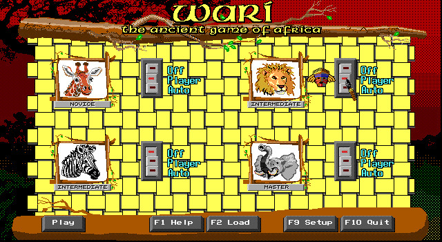 В данной игре – возможно, для создания нужной атмосферы – вашими противниками являются четыре африканских зверя: жираф (самый слабый игрок), лев и зебра (средние игроки) и слон (самый умный игрок). Поскольку это фактически перенесённая на компьютер настольная игра, то оценивать её графику смысла нет (хотя здесь замечательная VGA-палитра). Имейте в виду, что игра на деле ничуть не проще шахмат или шашек, требует весьма серьёзного изучения и напряжённого стратегического мышления, так что победить слона без долгих тренировок, скорее всего, не удастся.