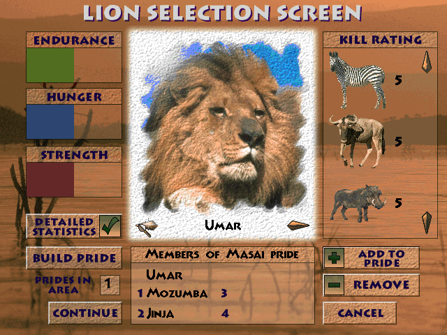 Этот не имеющий аналогов симулятор жизни льва перенесёт Вас в жаркую саванну, где разгуливают стада жирафов, диких кабанов, стремительных антилоп. Вам предстоит взять под свой контроль одного из львов и вести его через все опасности, встречающиеся на пути. А опасностей предвидится много: знойная погода заставляет постоянно держаться близ водопоя, стаи жертв постепенно движутся в разных направлениях и могут уйти далеко от мест обитания прайда, а коварные браконьеры с ружьями легко берут зазевавшегося хищника в кольцо. Охота тоже может обернуться плачевно – буйволы, например, если загнать их в угол, не преминут воспользоваться своими острыми рогами, и глубокие раны придётся ещё долго залечивать. За власть в прайде также нужно побороться – взрослые самцы-львы очень не любят уступать территорию. А чтобы продолжить род, ещё предстоит потрудиться и найти подходящую крепкую самку.