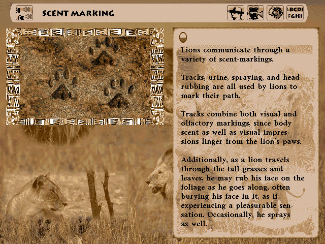 Задания представляют собой ещё больший интерес, поскольку отличаются необычностью и оригинальностью. Вам даётся вполне реальная ситуация, с которой предстоит максимально быстро и элегантно разобраться. К примеру, находящегося под Вашим контролем льва окружили звероловы из зоопарка с ружьями, заряженными транквилизаторами. После долгой охоты силы уже на исходе, но Вам необходимо помочь зверю выбраться из сжимающегося кольца и вновь почувствовать вкус свободы. Или, скажем, Вы получите возможность превратиться в молодую львицу, недавно родившую трёх детёнышей. Самое время заняться поиском еды. Быстрее найдите жертву неподалёку от Вашего пристанища, подгоните её как можно ближе к молодняку и убейте, предоставив детёнышам достаточное количество вкусного свежего мяса. Каждый лев в игре – не просто безликое животное, а имеющий своё имя и историю персонаж. Предыдущий опыт фигурирует и в некоторых заданиях – так, одному льву предлагается побороть свой страх перед буйволами, когда-то нанёсшими ему глубокую рану, и задрать несколько из этих крупных животных. И это – лишь малая часть предлагаемых миссий. Вам придётся и нагонять своих ушедших вперёд сородичей, и бороться за лидерство, и искать партнёра для любовных игрищ… Перечислять всё было бы слишком долго, достаточно сказать, что однообразной игра точно не будет. Кроме того, Lion снабжена и большим количеством фотографий, повествующих о дикой жизни, так что даже во время загрузки очередного уровня Вам будет на что посмотреть. А если Вас интересуют какие-то определённые моменты из области мира животных, добро пожаловать в особый раздел Lion Safari, дающий энциклопедическую информацию о многих интересных фактах, связанных со львами.