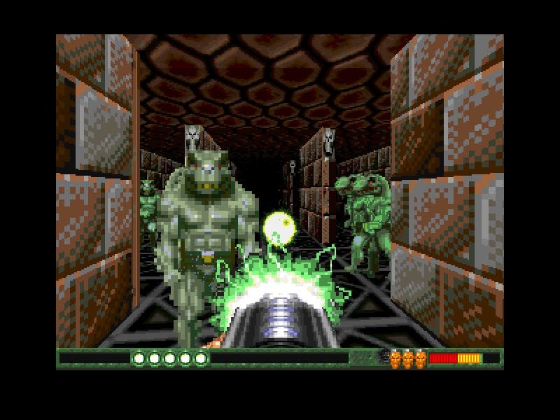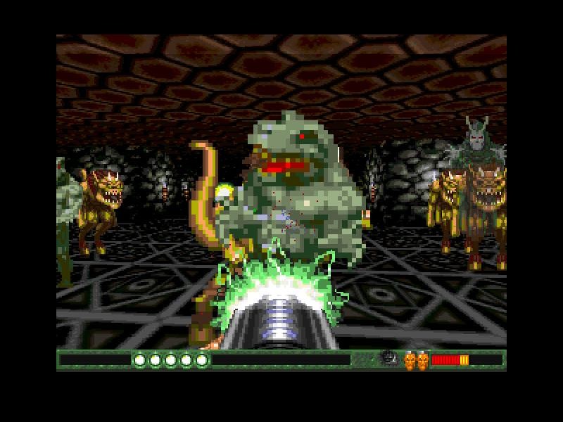 Что касается врагов, то самыми первыми вашими врагами станут вполне человекоподобные (даже больше, чем в Doom) солдаты, но очень скоро появятся здоровые лысые мужики, голые по пояс, которые не вооружены, но выносливы и очень здорово ранят, сражаясь вблизи. Буквально на первых уровнях вам впервые встретится и робот – большой и страшно урчащий индивидуум, который не только куда прочнее, но и умнее своих более слабых собратьев: он, стреляя долгими очередями синих шариков, не бегает, как сумасшедший, туда-сюда, что свойственно солдатам, а какое-то время прямо-таки целенаправленно преследует вас и смотрит своими глазами в ваши глаза. Зрелище ещё то… Но всё это очень скоро покажется вам просто детской забавой, так как впереди вас ждут поединки с людьми-ящерами, странными скелетами в плащах с капюшонами, которые швыряются огненными шарами, готического вида летающими призраками (вообще, на по-настоящему впечатляющем уровне «Gothic Tomb» - игру можно начать прямо с него - очень явственно чувствуется влияние не столько Doom, сколько Heretic) и прочими интересными тварями.