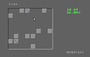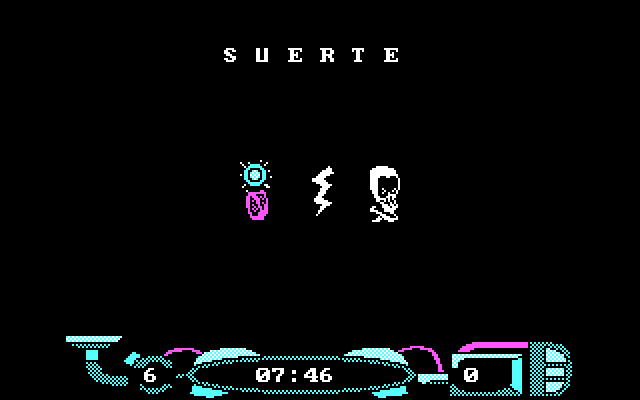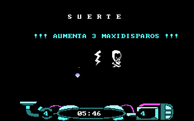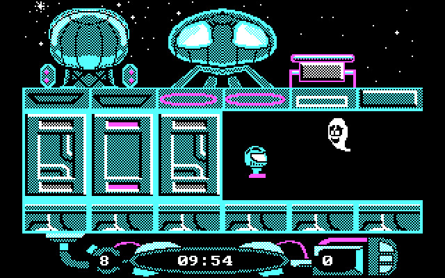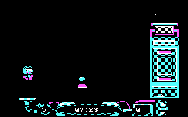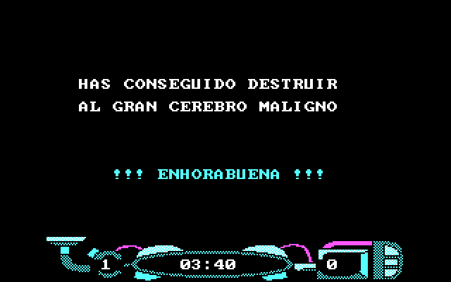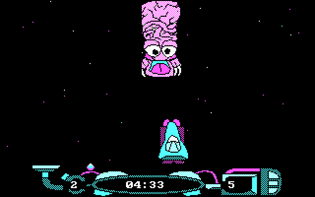 Раритетнейшая испанская игра в футуристическом стиле и без конкретного сюжета. Мы играем за некое головастое существо (улыбающаяся голова на ножках), которое истребляет других существ, перемещаясь по экранам.