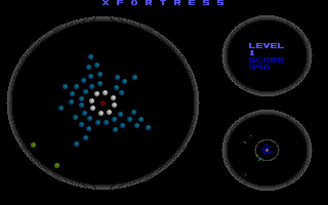 XFortress – весьма необычный и изобретательный вариант Tetris’а. Игровое поле здесь представлено в виде большой окружности (которая и является крепостью), в центре которой расположена малая окружность, состоящая из шаров-сегментов. Из-за предела «крепости» к нам с определённой периодичностью летят небольшие цепочки, состоящие из таких же шариков, как и центральная окружность. Летящие шарики окрашены в зелёный цвет и при соприкосновении с центральной окружностью (которая состоит из белых шариков) меняют цвет на синий и застывают. Задача игрока – собирать эти шарики в цепочки таким образом, чтобы ни один луч, состоящий из «прилипших» шариков, не вышел за пределы «крепости». Как это сделать? Во-первых, как и в Tetris’е, при выстраивании цельного ряда (в данном случае – при замыкании круга) шариков они исчезают (чтобы этого добиться, нужно вращать центральный круг с помощью мышки или правой и левой клавиш Shift (по часовой и против часовой стрелки соответственно), зажатая клавиша Ctrl увеличивает скорость вращения), во-вторых, шарики не будут появляться внезапно: на экране присутствует радар, показывающий направление движения и длину следующих сегментов.