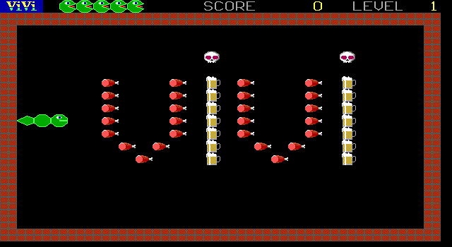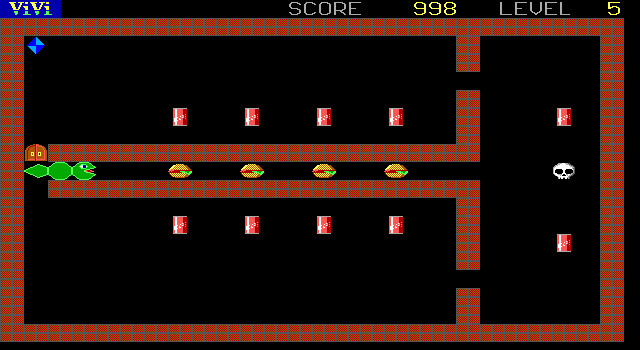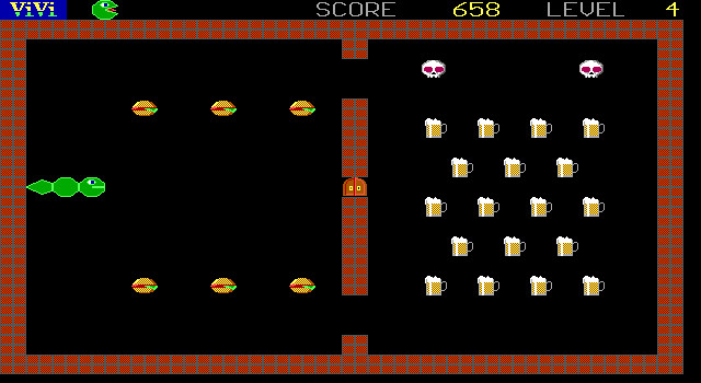 Клон игры Snake, сильно напоминающий другого клона – Vlak. Прежде всего графически, но не только. Игрок управляет зелёным змием, который находится на чёрном поле, по которому разбросаны различные виды пищи и напитков, а также разного вида несъедобные объекты типа черепов или склянок с ядом (однако синие камни съедаются с удовольствием и даже приносят дополнительную «жизнь»). Задача – поглотить всё съедобное и при этом избежать столкновений с несъедобным и с кирпичным. Желательно также избегать столкновений с собственным хвостом, но здесь имеет место один нюанс: летальным исходом закончится только фланговое столкновение. То есть если голова догонит кончик хвоста, то она начнёт есть его. Это приведёт к потере очков, однако не будет считаться проигрышем. Иногда использование этой особенности может стать существенным подспорьем, так как сложность уровней нарастает достаточно быстро, а самих их здесь пятьдесят.