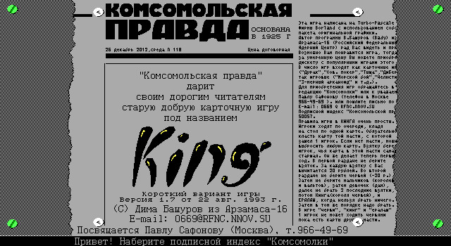 Бессмертная классика отечественного игростроя времен его зарождения - игра King от Вадима Башурова со ставшими народно любимыми персонажами из советских мультиков Пятачком, Винни-Пухом, Иа-Иа, Багирой, Фрекен Бок и другими. Приятно видеть элементы дизайна в оформлении игры. Так, заглавный и финальный экраны оформлены под газетные вырезки из "Комсомолки", графика же целиком позаимствована из "Поля Чудес" того же автора - даже сникерсы при проигрыше дают такие же. Отдельно стоит отметить тот факт, что игра запоминает общую сумму выигрыша по каждому пользователю и ведет таблицу "миллионеров" - с общим капиталом и количеством игр. Таким образом, раньше, когда игра распространялась копированием на дискетках, у всех были копии с предыдущими игроками и был стимул набрать еще больше.