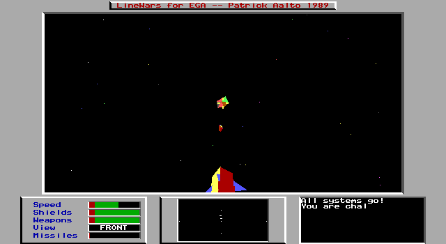 Пожалуй, одна из первых игр своего жанра, ориентированных главным образом не на одиночный режим, а на бои между несколькими игроками по модемному подключению. LineWars – это космический аркадный шутер с достаточным набором функций для ведения войны. Вы находитесь в кабине звездолёта, на котором установлены две лазерных пушки и ракетница. Огонь можно вести в двух направлениях – перед собой и позади себя, причём игроку в любой момент доступны камеры наблюдения, показывающие обстановку не только с кормы или кокпита, но и по бокам истребителя. Индикаторы на экране отображают текущее состояние таких показателей, как скорость, сила энергетического щита и заряд лазера. Стрелять лазерными лучами можно в любой момент и в неограниченных объёмах – шкала довольно быстро восстанавливается. Щит тоже имеет свойство перезаряжаться, но только в том случае, если с момента последнего попадания по вам прошло некоторое время. Ракетница же доступна только тогда, когда вы поймали врага на прицел, причём боеприпасы для неё ограничены, а саму пушку может ещё и заклинить, в случае чего о её использовании до конца боя можно забыть.