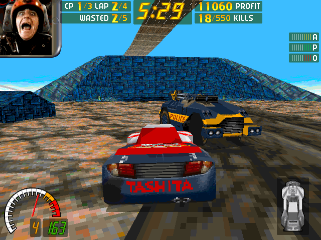 Во-вторых, машины. О-о-о, Eagle II - просто произведение искусства! Да и остальные тоже не подкачали. На полигоны разработчики не поскупились, равно как и на цвета. Даже когда вы пройдете все гонки, то вряд ли запомните, какая из машин какому водителю принадлежит. Среди всего этого разнообразия игрок узнает пару-тройку автомобилей из первого Carmageddon'а: "Tashita" Эда 101, "StiffShifter" братьев Гримм, "Electric Blue" Стеллы Стьюнны и некоторые другие.