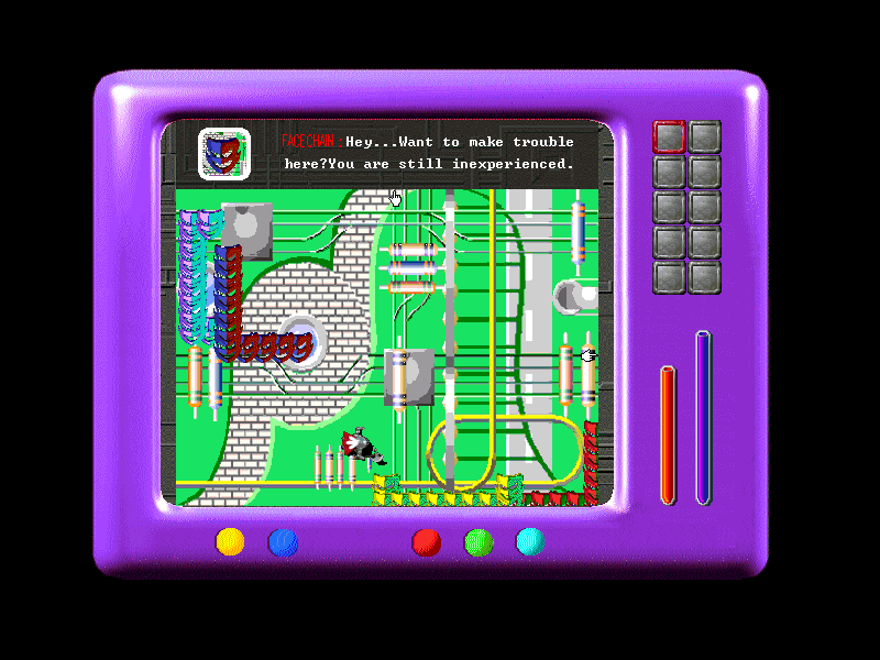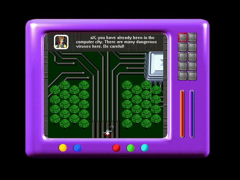 В геймплее нужно много ходить по дорожкам печатной платы к микросхемам в компьютере, заходить внутрь чипов (!) и сражаться там с полчищами вирусов. Из параметров, отвечающих за состояние игрока, имеются только два неподписанных индикатора справа: красный бар и синий бар, и судя по тому, что игра заявлена как RPG, это соответствует мане и здоровью.