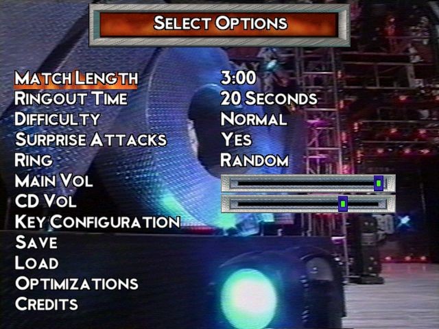 Всего на выбор доступно 48 бойцов, хотя изначально некоторые из них «скрыты». Естественно, что все наиболее известные у нас рестлеры, как те же Халк Хоган или Голдберг, в игре будут, что не может не радовать. Перед матчем можно настроить кое-какие его параметры – например, выбрать арену, установить допустимое время поединка, разрешить или запретить «вмешательства» и так далее. У каждого бойца имеется определённый запас здоровья (у всех примерно одинаковый), отображаемый на экране полоской и сокращающийся по мере пропуска ударов; после получения повреждения полоска постепенно восстанавливается. Когда полоска противника становится красного цвета – можно попробовать выполнить на нём «добивание», чтобы завершить поединок своей победой.