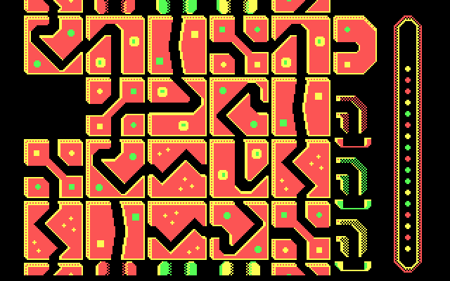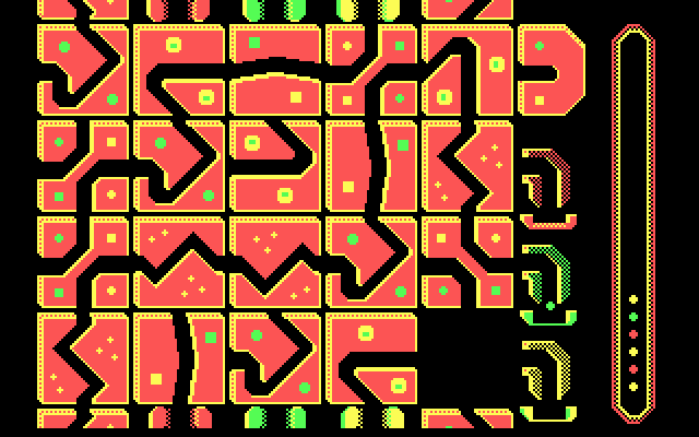 Наше «рабочее место» оборудовано следующим образом: слева от игрового поля постоянно появляются шарики трех цветов, справа же находится три «накопителя-чашки» соответствующих цветов и «колба» с шариками, указывающая, в какой последовательности они будут появляться. Само игровое пространство состоит из 19 плиток (три горизонтальных ряда по пять и один – из четырёх), на которых изображены коридоры различных форм и направлений. По ним мы и должны провести каждый шарик до своей чашки. Плитки необходимо двигать (как в пятнашках) и поворачивать, соединяя пути в единую систему, причем все манипуляции можно производить, даже когда шарик уже попал на активный сегмент. Для удобства коридор можно и нужно замыкать в вертикальном направлении (уверяю, так вам придется поступать не единожды!) – это может значительно облегчить выполнение задачи. Нетрудно догадаться, что любое столкновение шарика со стеной (тупиком) ведет к его потере. Вот такой запутанный бильярд.