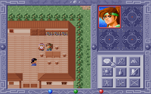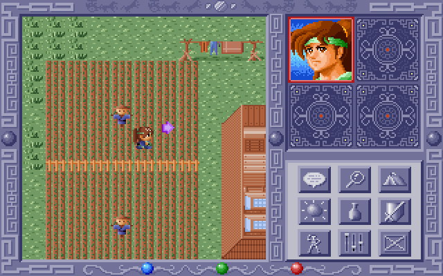 Далее можно рассмотреть главное игровое меню. Оно выполнено в виде кнопок с нарисованными на них иконками. Таких пунктов меню всего девять, и расположены они в нижней правой части игрового экрана (перечисление слева направо, сверху вниз). Кнопки тут следующие: «Говорить» – встаньте рядом с NPC, и он вам поведает что-то интересное; «Лупа» – поиск какого-либо предмета; «Палатка» – отдохнуть от тягот пути (редко где удаётся); «Заклинания» – применить магию из списка; «Бутылка» – работа с носимыми предметами, можно выкинуть или применить; «Щит и Меч» – отображение уровня боевой готовности персонажа (сила, вооружение, доспехи); «Человечек» – общий статус и вывод всех RPG-параметров. Затем идут две ещё более понятные – «Настройки» и «Выход». Каждый пункт меню открывает аналогичные подпункты из девяти кнопок, которые могут относиться к другим персонажам из вашей команды, а также к предметам или заклинаниям.