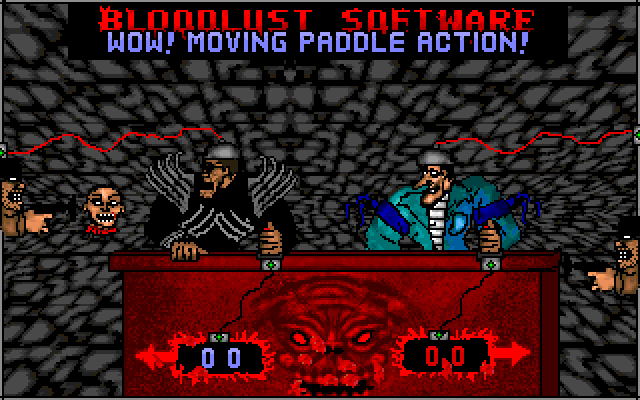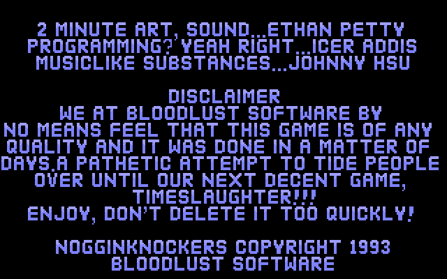 Nogginknockers - это первая часть из серии кровавых Pong'ов за авторством Bloodlust Software, продукты которой отличаются специфической ироничностью, основанной на кишках и расчленёнке. Игра распространялась бесплатно и являлась своеобразным промо для Timeslaughter, которая вышла в 1996-м году. Кстати, Nogginknockers 2 распространялась вместе с ней в качестве бесплатного бонуса.