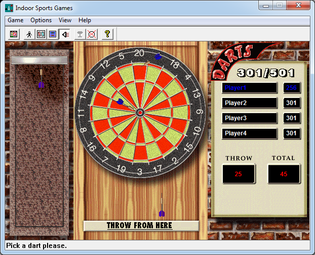 В игре Darts (дартс) вам надо кидать дротики по полю с определённым количеством очков за каждый сектор; выигрывает первый, кто уменьшит количество очков до 0.