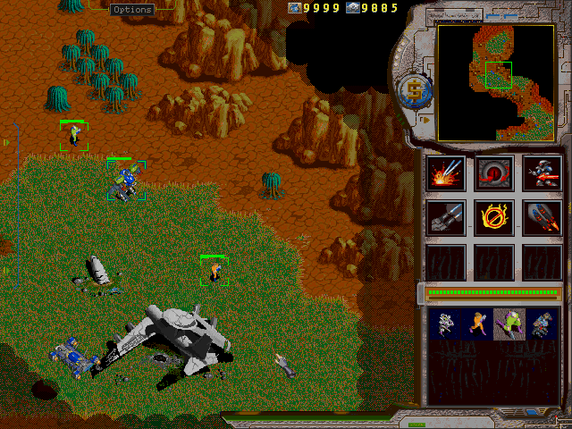Да… C сюжетом всё понятно. Стратежка приятна своей продуманной графикой и совсем даже не напрягает игрока в плане «шевели извилиной». Выделяем мышью свои юниты, указываем правой кнопкой: «куда…» или «кого…». В центре справа выделены девять слотов, где можно выбрать различные подрежимы действий одного юнита. Для летающего робота это дополнительные команды: взлёт/посадка, пилоту вылезти из кабины, режимы огня и прочее. Помимо летающего робота, в вашем отделении будут обычные пешие юниты небольшого размера. У них параметры нападения, обороны, огневой мощи будут наименьшими. Помимо военных, на картах есть гражданские, которых необходимо защищать от врага. Также в сквад можно брать специалистов. Например, маленький инженер может запросто соорудить гигантский строительный объект за считанные секунды. Экономика тут как бы… она сама по себе. Вся собирающая техника (харвестеры?) сама летает куда-то, спайс (или как там это ещё называется – кристаллы) сам «течёт» на специальные пункты (Souce Station). Из полезных строений можно отметить: War Factory – выпускает военную продукцию, есть ещё Оборонное сооружение (Defence), а также стационарные пулемёты и ракетные установки. Значком «Доллар» можно запросто продать любой объект, наведя на него соответствующий маркер в виде трёхмерного “$”. В верхней правой части экран расположена карта, на которой постепенно открываются тёмные неизведанные участки. Задачи любой миссии предельно просты и кратки: защитить людей, уничтожить противников, построить что-нибудь и т.п. Вообще, в китайском Интернете рецензиями отмечается некое сходство геймплея с Warcraft.