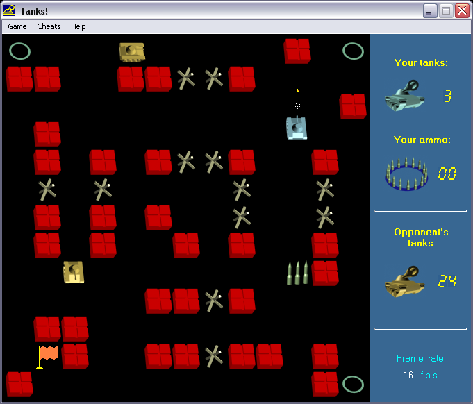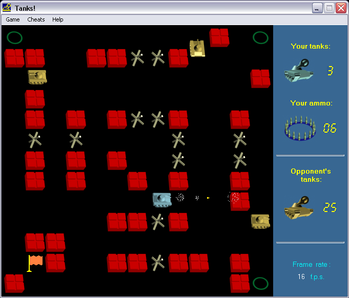 Но самое интересное в данной игре - куча настроек, так или иначе влияющих на ход игры. В отдельном окне можно выставить количество жизней и снарядов у игрока, число танков для уничтожения, число FPS, временной интервал между появлениями врагов, скорость (!) и так далее. Более того, для облегчения прохождения сделан даже отдельный пункт "Cheats", где присутствуют режимы бессмертия, бесконечной амуниции, защиты флага... В общем, Tanks! - это ещё и неплохой полигон для проведения собственных экспериментов.