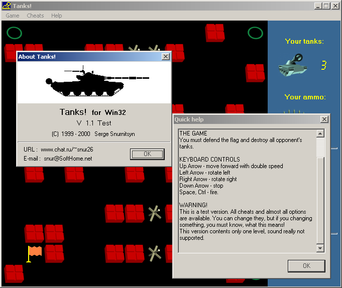 Tanks! - довольно любопытная версия знаменитой Battle City (или Танчиков). Создана она нашим соотечественником Снурницыным Сергеем и принимала участие в Первом национальном конкурсе компьютерных игр в России "Наша игра - 2000".