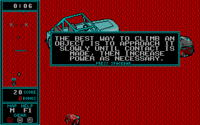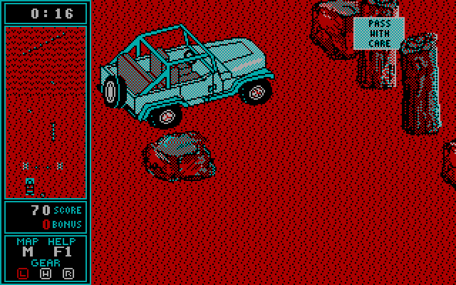 Графика - только CGA, но на редкость чёткая и приятная, не в последнюю очередь из-за непривычного размера автомобиля, который занимает, наверное, с четверть экрана. Порекомендовать игру с учётом её необычности можно разве что любителям спокойных, не слишком (по своей сути) сложных, но непривычных по тематике паззлов.