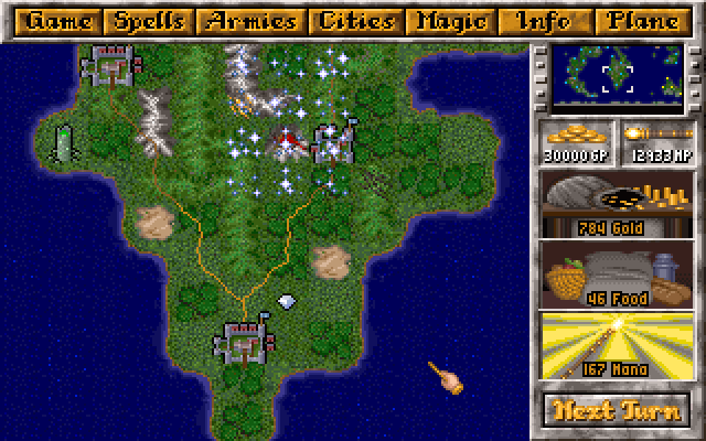Ландшафт очень напоминает Civilization. Там вот водичка, вон там олень, тут золотая жила. Если город будет стоять близко к подобной жиле, и мы построим в нем шахты, то будет прирост в продуктивности. Если же он около леса, и мы оборудуем город лесопилкой - также, денежные потоки потянутся в наш город. В начале игры мы можем строить лишь столь знакомых нам поселенцев (settlers). Они, если находятся в удалении от городов, смогут воздвигнуть новый поселок. Скорость роста поселка целиком зависит от выбранной вами расы. Тут-то этот важный фактор и входит в игру. Рас всего четырнадцать. Но сразу выбрать можно не все. Дело в том, что мир MoM имеет две стороны, фактически это просто два мира. На светлой стороне живут по возможности добрые народы: люди, халфлинги, эльфы, возможно орки. Всего девять рас. На темной же стороне находятся оставшиеся пять. Среди них наблюдаются темные эльфы, тролли и… карлики (dwarves). Видимо они приписаны сюда для поддержания баланса.