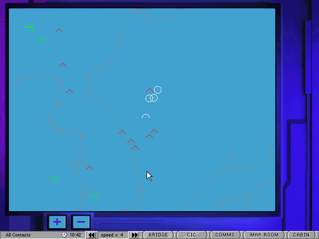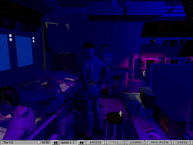 Поскольку в данной игре вы "отыгрываете" роль капитана, то можете, к примеру, лично подняться на капитанский мостик и понаблюдать за работой подчинённых! Удивляться не нужно - да, в этой игре действительно можно "бродить" по отсекам корабля в "дискретном" режиме, с теплотой вспоминая старые квесты. Но гораздо важнее то, что вам подконтролен в буквальном смысле слова весь корабль, все его системы, орудия и элементы: степень детализации игрового процесса очень высока, что, естественно, его усложняет. Графическая реализация тоже интересна: во время исполнения ваших приказов или иных событий вы можете видеть условную карту района, в котором находитесь (морскую, разумеется), небольшую приборную панель, а в правом нижнем углу - визуальное отображение в виде видеоролика (!) того, что сейчас произошло (например, запуск ракеты по вашему приказу или же попадание в вас вражеского судна), - и таким образом вы сможете в деталях (но без общего плана) наблюдать за каждым событием боя.