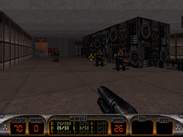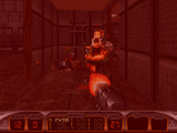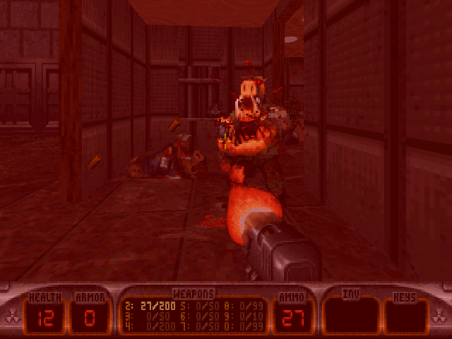 При этом, некоторые уровни (подчеркиваю некоторые, тут автор описания, как мне кажется, несколько сгустил краски) могут похвастаться действительно БОЛЬШИМ числом противников на уровне. Однако при грамотном использовании арсенала Дюка (в первую очередь дистанционно подрываемых гранат, РПГ, девастатора) имеющихся на уровнях боеприпасов вполне хватает для расправы над супостатами. Кстати, на некоторых уровнях можно встретить довольно нестандартных врагов, ранее, если мне не изменяет память, в играх про Дюка (по крайней мере официальных) не встречавшихся, например парочка карликовых Cycloid Emperor,, погибающих от одной - двух ракет из РПГ или невидимок - Enforcer ов. Жаль только, что разработчики опять не воспользовались наработками дополнительного четвертого эпизода к оригинальной игре и не включили в аддон противников оттуда - ни свинотанков, ни похожих на Чужого пришельцев тут увидеть не удастся. Нет и новых боссов. При этом, у данной игры странная фишка - боссы всех трех эпизодов заперты в своего рода "клетках", т.е. перемещаются по узкому пяточку и просто поливают игрока из всех стволов...