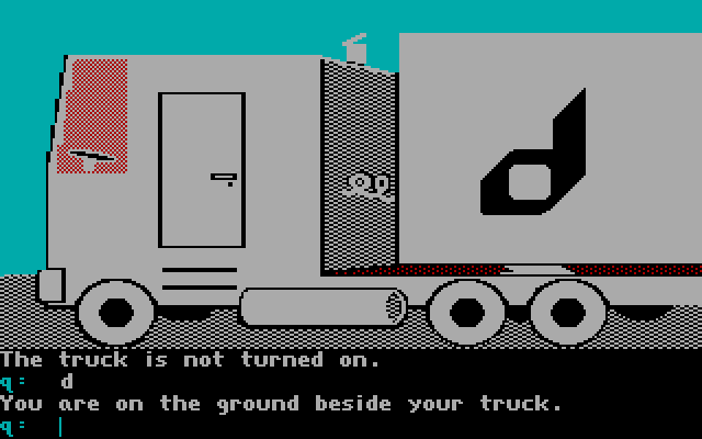 Графика - только CGA, довольно бледная, но в целом приятная. Игра представляет собой интересный вариант направления "Interactive Fiction with Graphics", при этом являясь не квестом, а чем-то трудноопределимым с жанровой точки зрения. Всё "общение" с ней происходит путём ввода с клавиатуры команд (путём их ручного печатания), обозначающих те или иные действия: для следования в том или ином направлении будет достаточно только первой буквы слов "восток" или "юг" (на английском, разумеется), а вот для того, чтобы поесть или, скажем, заправиться, придётся уже печатать слова. Команд, повторим, много, поэтому для маленьких детей игра, пожалуй, не подойдёт.
