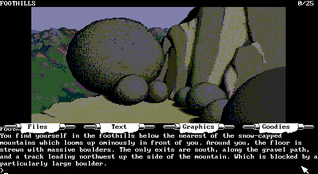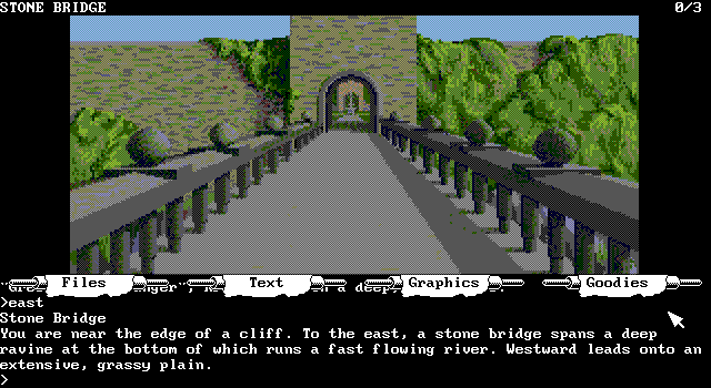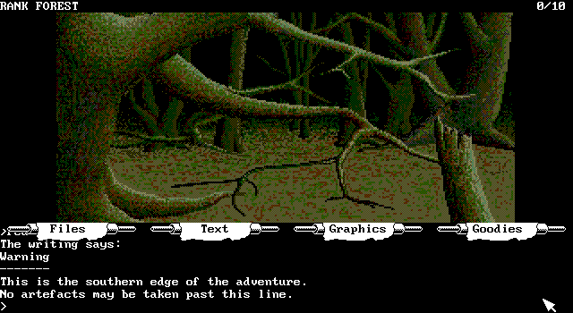 Но сюжет в The Pawn - как ни странно, ибо на деле он весьма интересен и изобилует примечательными поворотами, персонажами и побочными заданиями, - вторичен по отношению ко всему остальному, - а этого "остального" тут масса. Во-первых, великолепные по своей подробности и стилю тексты (не умещающиеся на экран целиком, поэтому придётся пользоваться опцией прокрутки), во всех деталях описывающие посещаемые вами локации, ситуации и персонажей. Во-вторых, как ни странно, графика - рисованная, но по своему качеству близкая к фотореалистичной, в необычном разрешении 640х350 и позволяющая нам своими глазами увидеть просторные луга и комнаты с, казалось бы, вполне современной мебелью, волшебников и лам - в причудливой Керновии нашлось место всему. В-третьих, по-настоящему сложные загадки, пусть зачастую и основанные на использовании содержимого инвентаря, и едва ли не самый продвинутый в истории IF анализатор вводимых команд, с помощью которых осуществляется управление игрой: он не только распознаёт огромное количество слов и требует подчас ввода не самых простых конструкций, но и позволяет, к примеру, ввести команду по использованию конкретного предмета, не трогая при этом все остальные. Кроме того, команду в любой момент можно полностью или частично стереть или изменить.