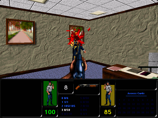 Уже в начале игры герою доступны пистолет и нож, далее арсенал и боезапас будут только увеличиваться, ибо с трупа каждого убитого противника можно будет что-то подобрать (что логично - он ведь в вас стрелял). Противники эти, к сожалению или нет, особенно интересными названы быть не могут - хотя видов их тут хватает, но все они люди, пусть то в деловых костюмах, то в форме, напоминающей полицейскую. Процесс убийства в плане быстроты не слишком реалистичен - супостаты зачастую разваливаются на ошмётки с нескольких выстрелов, причём от ножа погибают едва ли не быстрее, чем от пуль. Кстати говоря, присутствует возможность осмотра мышью - так называемый "мауслук", но удобной её реализацию тут назвать нельзя. Да и вообще *такие* игры лучше проходить "дедовским" методом "тракториста" - так попросту интереснее.