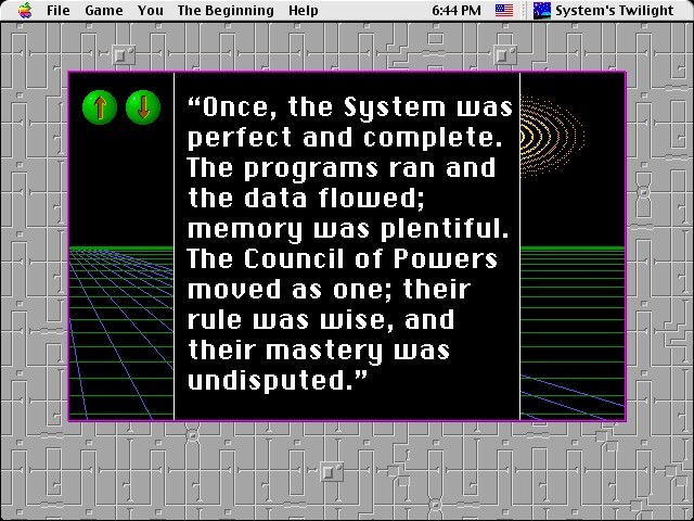 Как по внешнему виду, так и по сюжету и игровому процессу «System’s Twilight» очень даже напоминает третью Mac-головоломку Джонсона, пусть и будучи куда беднее в плане графики и разнообразия головоломок. Зато сюжетной составляющей здесь отводится ничуть не менее выдающаяся роль, позволяющая причислить игру если не к полноценным адвенчурам, то хотя бы к играм, могущим похвастаться своими квестовыми элементами. Действие разворачивается внутри компьютера, переживающего далеко не самые лучшие времена: Совет Сил, управлявший ранее всей жизнью электронного мира, куда-то бесследно исчез, многие системы не функционируют, а местные обитатели ведут себя крайне странно. Да и вид, и имена у них как нельзя более абстрактные – как и у самого главного героя, которому (о чём легко догадаться) как раз и предстоит приводить всё в порядок и спасать окрестные «земли» от погружения в полный хаос, пытаясь разыскать эти самые пропавшие старые Силы.