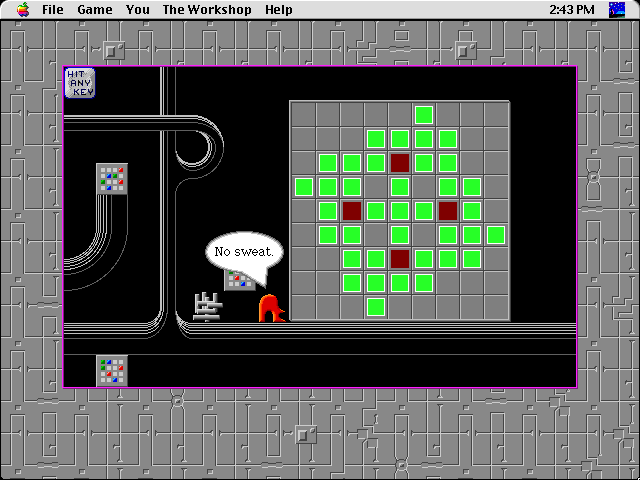 В отличие от игр Клиффа Джонсона, в каждом отдельном районе загадки оказываются скорее однотипными: в Лесу мы проходим лабиринт из меняющихся на ходу клеток с тропинками, в Мастерской соединяем попарно проводниками несколько одинаковых точек, нырнув в Реку, сталкиваемся с оригинальными загадками на последовательную замену букв в словах, - и так далее. Будут здесь и варианты «Сокобан», и воспроизведение нужных фигур из квадратиков, и буквальное отгадывание загадок с набором ответов с клавиатуры, и многое другое. При этом даже на указанную однотипность предлагаемых нам задачек жаловаться не очень хочется, так как следуют они друг за другом, постепенно усложняясь (готовьтесь снова и снова перезапускать загадки после неверного действия!), а для решения некоторых из них требуются предметы, выдаваемые за успешное прохождение других районов электронного мира.