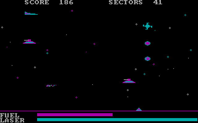 Управлять нужно едва заметным (визуально) космическим истребителем; действие, судя по всему, происходит в космосе, однако нижняя граница экрана в виде красной полосы вполне реальна и смертельно опасна - поэтому можно пофантазировать, что мы летим над какой-нибудь бесконечной космической платформой. Никакого сюжета, как и положено, нет - "просто" летим и стреляем. Типы враждебных объектов разные: есть "висящие" в воздухе мины, контакт с которыми недопустим, есть непонятные летающие объекты (похожие, извините, на свастику), столкновение с которыми тоже смертельно, но которые сами не проявляют агрессии, а есть стреляющие непосредственно по вам из пушек летающие тарелки. Истребитель может подниматься и опускаться в рамках экрана, можно также увеличивать и уменьшать его скорость (вплоть до кратковременного зависания в одной точке). Игровой мир состоит из так называемых секторов - не очень больших по размерам.