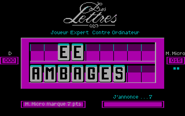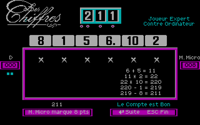 В компьютерном варианте введён и третий тип раундов (впрочем, возможно, в реальной передаче он тоже когда-то был): решение простых математических уравнений на время. Игра позволяет отключить перед стартом любой из двух типов раундов (то есть даёт возможность играть только в "цифры" или только в "буквы"), а также убрать ограничение по времени на продолжительность раунда. Графика - CGA, причём фактически и она отсутствует: разве что буквы и цифры обрамлены цветами. Обратите внимание, что для победы в раундах "на буквы" нужно обязательно хотя бы как-то знать французский язык, но в математических раундах этого, естественно, не требуется. Таким образом, данную вещь можно порекомендовать любителям простых математических головоломок всех возрастов и, например, изучающим французский язык детям.