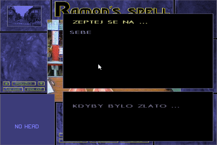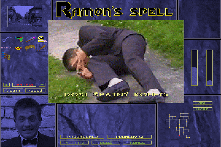 Зато интерфейс «Ramonovo Kouzlo» довольно-таки замысловат и потому заслуживает отдельного подробного рассказа. По традиции ранних FMV-приключений состоит он из множества окон, которых здесь насчитывается целых девять. Рассмотрим их сверху вниз и слева направо. Первым в верхнем ряду идёт маленькое изображение одной из локаций, выбранных нами на карте (зачем – непонятно: вероятно, исключительно для ориентации на местности); вверху посередине красуется название игры (должно быть, чтобы не забывали, – примечательно, что это единственная здесь фраза на английском, а не на чешском языке); завершается верхний ряд окошком с изображением предметов, плохо лежащих в данной локации (если, разумеется, там вообще что-либо лежит в настоящий момент).