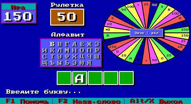 После выбора количества игроков (от одного до трёх человек за одной клавиатурой или мышью) и темы появляется экран с загаданным словом и алфавитом (причём одна буква отсутствует - буква И также открывает Й). Все сектора на барабане (здесь именуемом рулеткой) присутствуют - более того, игроку может попасться уже давно забытый сектор "Альтернатива" с угадыванием дополнительного слова. Возможность сразу назвать угадываемое слово также имеется.