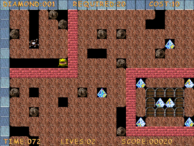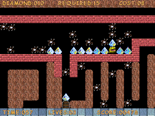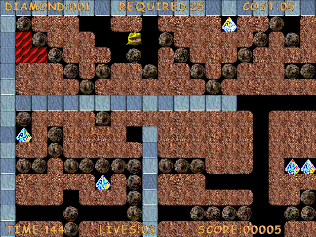 Геймплей полностью повторяет вышеупомянутый Boulder Dash - вид сверху, нужно собрать необходимое количество алмазов и прийти к выходу, остерегаясь противников и тяжелых булыжников. Были добавлены и отличия - например, лава, а также волшебные кирпичные блоки, превращающие камни в алмазы. В игру входят два набора уровней - обычный и очень лёгкий (для новичков). Этапов не так много, зато есть удобный в использовании редактор.